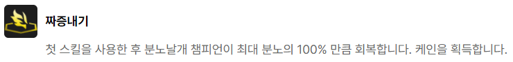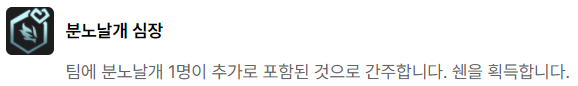 용술사 스웨인덱에서는 우선 용술사 관련 증강체 또는 분노날개 상징 관련 시너지를 추천드립니다. 스웨인이 제일 핵심이기 때문에 스웨인을 강화시켜주는게 좋습니다. 특히 분노날개 심장 또는 분노날개 문장을 고르는 경우 분노날개(3) 시너지를 함께 챙길 수 있기 때문에 안그래도 용술사로 강력해진 스웨인이 한층 더 강력해집니다. 이 이외에도 전투 관련으로는 최고의 친구, 최후의 저항, 사냥의 전율, 천상의 축복 시리즈도 잘 어울리는 편입니다.