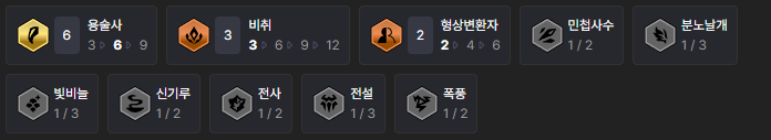덱을 완성시키면 기본적으로 챙길 수 있는 시너지는 용술사(6), 비취(3), 형상변환자(2) 입니다. 빠르면 7레벨에 덱이 완성되고 8레벨에 덱을 완성시켜도 한 자리가 비는데, 이 때를 미리 대비해서 특성/시너지를 챙겨주면서 어떤 시너지로 덱을 강화할지 결정해야 합니다.