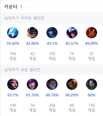 카운터로는 애니비아, 럼블, 리산드라, 탈론, 탈리야가 상대하기 어렵다는 통계가 나왔으며, 르블랑, 신드라, 사일러스, 아크샨, 아칼리를 상대로는 우세한 승률의 통계가 나왔습니다. 기본적으로 라인 클리어가 느린 챔피언들을 상대할 때에 높은 승률을 거두는 것이죠.