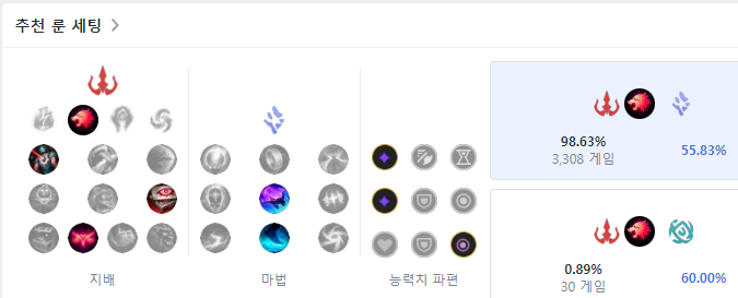 지배 룬에서 포식자 룬을 메인으로 사용하고 하위 룬으로는 비열한 한 방, 사냥의 증표, 영리한 사냥꾼 룬을 사용합니다. 보조 룬으로는 마법에서 기민함, 물 위를 걷는 자 룬을 들어주면 됩니다. 능력치 파편의 경우 적응형 능력치 두 개와 상대 라이너가 AP라면 마법 저항력을, AD라면 방어력을 들어주면 되구요.