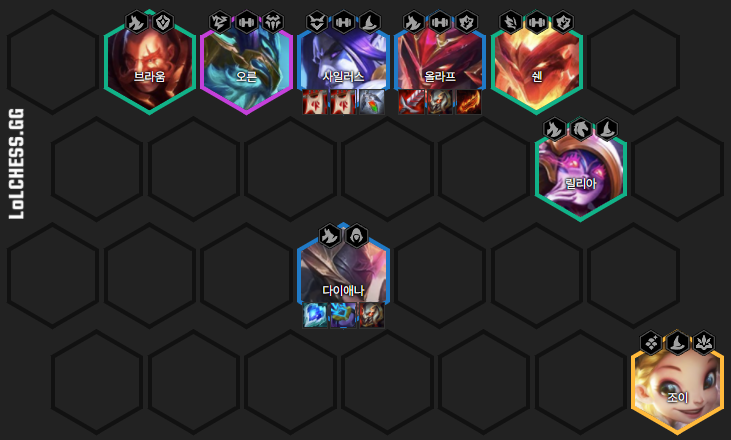 비늘혐오자 올라프덱은 릴리아, 브라움, 쉔, 다이애나, 사일러스, 올라프, 오른, 조이로 이루어져 있습니다.