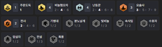 비늘혐오자 올라프덱은 완성시켰을 때 기본적으로 챙길 수 있는 시너지들은 주문도둑(1), 비늘혐오자(4), 난동꾼(4), 요술사(3), 전사(2)입니다.