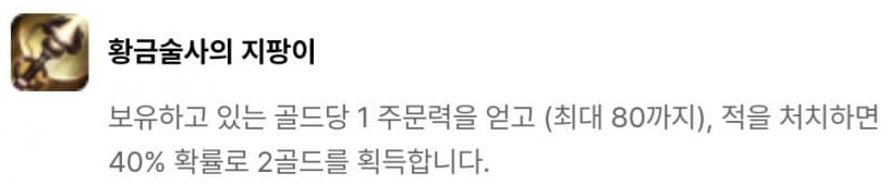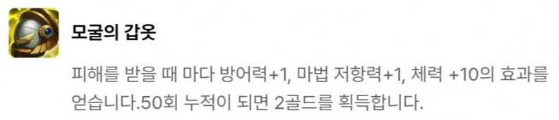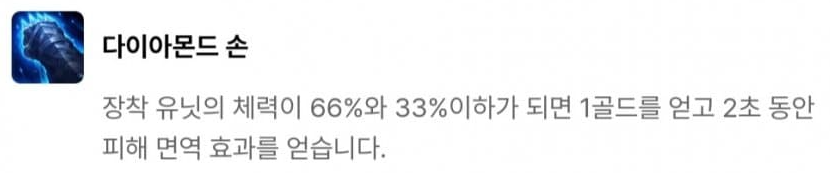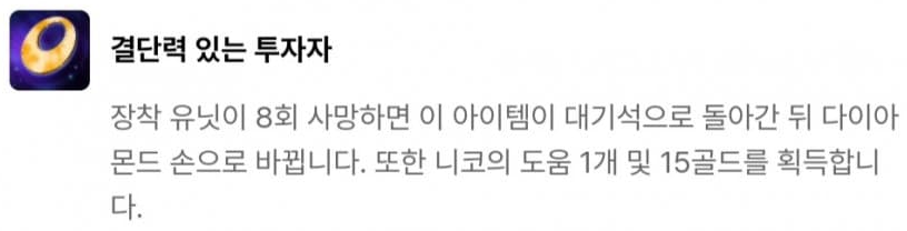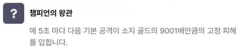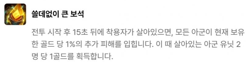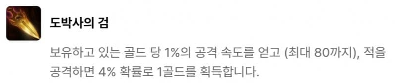 결단력 있는 투자자, 다이아몬드 손, 황금술사의 지팡이, 드레이븐의 도끼, 도박사의 검, 모굴의 갑옷, 쓸데없이 큰 보석, 현자의 돌, 챔피언의 왕관으로 이루어져 있습니다. 그 중 빛비늘(9)를 달성하면 등장하는 챔피언의 왕관은 매 5초 마다 다음 기본 공격이 소지 골드의 9001배만큼의 고정 피해를 입히는데, 이는 사실상 5초마다 기본 공격으로 적 한명을 즉사시키는 것과 같죠. 다만 적이 CC기를 연속으로 사용하여 기본 공격을 때릴 기회를 주지 않을 수 있기 때문에 개인적으로는 수은과 함께 주면 좋은 빛비늘 아이템 같습니다.