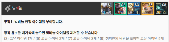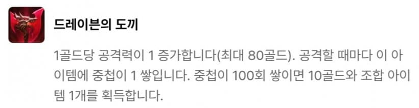 결단력 있는 투자자, 다이아몬드 손, 황금술사의 지팡이, 드레이븐의 도끼, 도박사의 검, 모굴의 갑옷, 쓸데없이 큰 보석, 현자의 돌, 챔피언의 왕관으로 이루어져 있습니다. 그 중 빛비늘(9)를 달성하면 등장하는 챔피언의 왕관은 매 5초 마다 다음 기본 공격이 소지 골드의 9001배만큼의 고정 피해를 입히는데, 이는 사실상 5초마다 기본 공격으로 적 한명을 즉사시키는 것과 같죠. 다만 적이 CC기를 연속으로 사용하여 기본 공격을 때릴 기회를 주지 않을 수 있기 때문에 개인적으로는 수은과 함께 주면 좋은 빛비늘 아이템 같습니다.