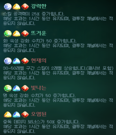 또한 정령석은 한번 세공을 하게 되면 한 시간 동안 적용되며, 하나의 정령석 버프만 적용받습니다. 만약 시간이 안 되었는데 다른 정령석 버프를 원한다면 해제하기를 눌러 기존의 버프를 없애고 다시 새로 세공을 해야합니다. 여기에서 적용된 버프는 같은 계정 내 모든 캐릭터에게 적용되며, 상급던전에도 적용됩니다.