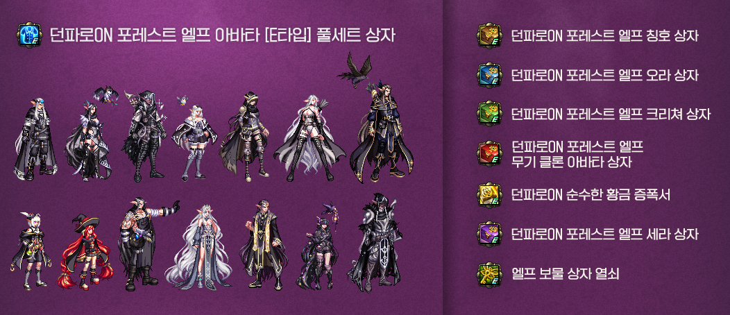 던파로ON 포레스트 엘프 패키지를 개봉하면 던파로ON포레스트 엘프 아바타 [E타입] 풀세트 상자, 던파로ON 포레스트 엘프 칭호 상자, 던파로ON 포레스트 엘프 오라 상자, 던파로ON 포레스트 엘프 크리쳐 상자, 던파로ON 포레스트 엘프 무기 클론 아바타 상자, 던파로ON 순수한 황금 증폭서, 던파로ON 포레스트 엘프 세라 상자, 엘프 보물 상자 열쇠를 얻을 수 있습니다. 참고로 아래 이미지 설명에는 교환가능이라고 나와있지만, 그건 세라샵에서 구매한 경우고, 이벤트로 지급받는 구성품들은 전부 계정귀속이거나 교환 불가니 참고바랍니다.