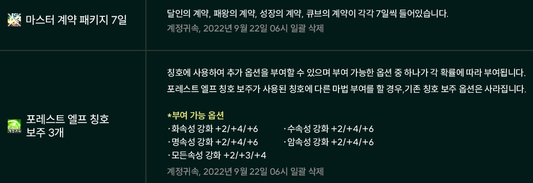 세라 상자에서는 마스터 계약 패키지 7일과 포레스트 엘프 칭호 보주 3개를 받을 수 있습니다. 이 포레스트 엘프 칭호 보주는 포레스트 엘프 칭호에 사용할 수 있습니다. 당연하게도 옵션은 랜덤으로 설정됩니다. +6 속성 강화가 나온다면 좋겠지만, 그것도 굉장히 힘들기 때문에 적당히 +4로 타협보는 것을 추천드립니다.