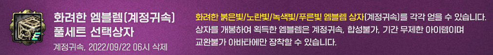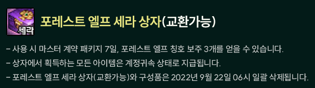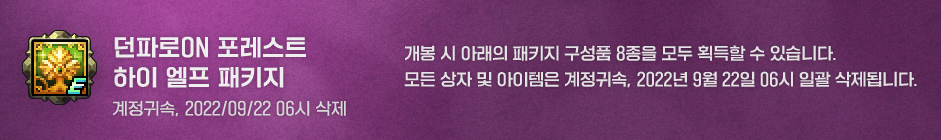 먼저 이벤트로 지급되는 최초의 상자입니다. 계정귀속이며 2022년 9월 22일 06시 삭제됩니다. 사용하게 되면 계정귀속 포레스트 하이 엘프 패키지와 화려한 엠블렘[계정귀속] 풀세트 선택상자를 획득할 수 있습니다.