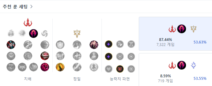 브랜드 룬은 안그래도 강력한 데미지를 스택을 쌓으면 쌓을수록 더욱 극대화시켜주는 어둠의 수확을 들어줍니다. 궁극기 및 화상 상태의 적에게 E를 사용하여 은근 쉽게 어둠의 수확 스택을 쌓을 수 있기 때문입니다. 하위 룬으로는 비열한 한 방, 사냥의 증표, 궁극의 사냥꾼을 들어주며, 보조룬으로는 정밀에서 침착과 최후의 일격을 들어줍니다. 마지막으로 능력치 파편은 적응형 능력치 두 개와 방어력을 들어주는게 보통입니다.