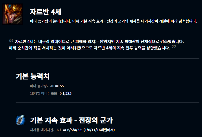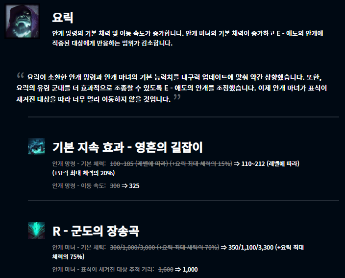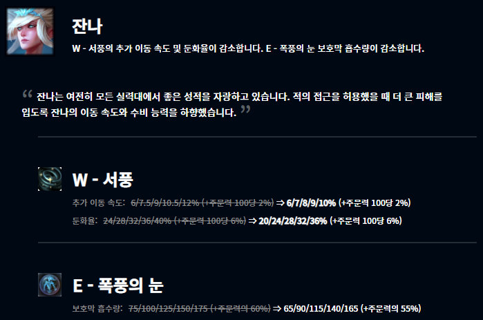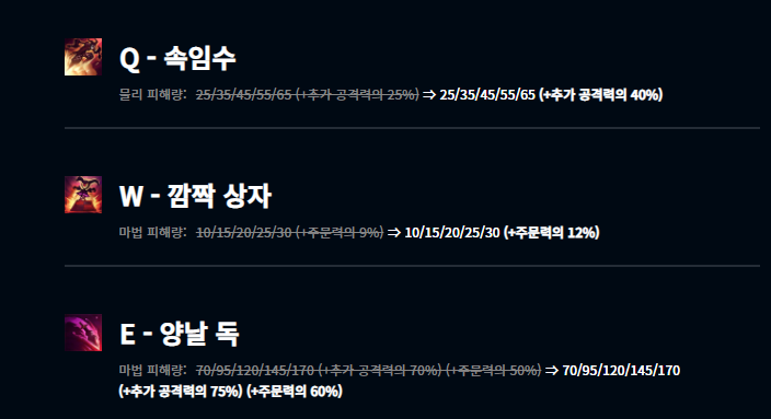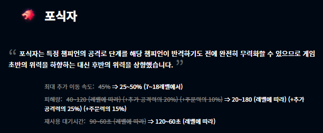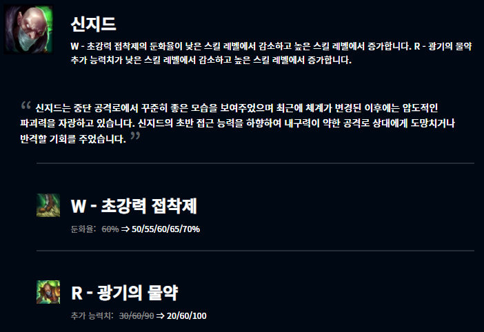 최근 미드 신지드가 1티어로 올라오고, 그에 따른 패치인것으로 보입니다. 최대 추가 이동 속도가 7레벨에서 18레벨 사이에 25~50%로 적용되게 변경되었고, 초반 위력을 하향시켰으며 반면 후반에는 더욱 강력하게끔 변경되었습니다.