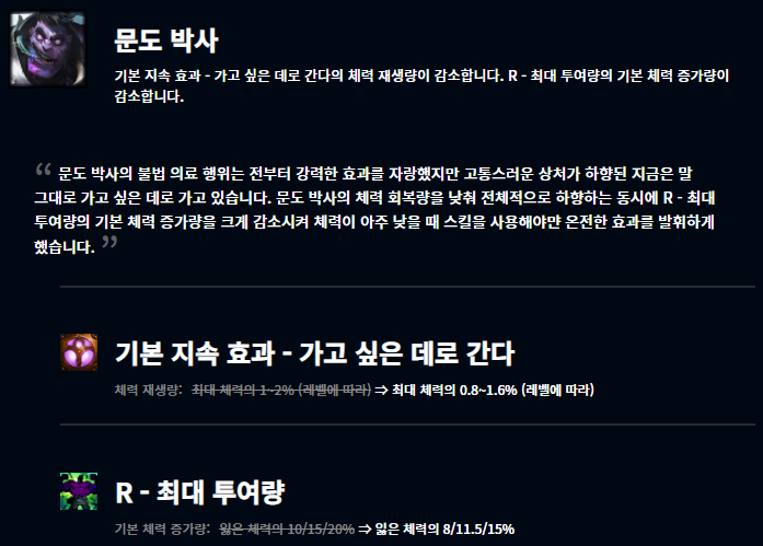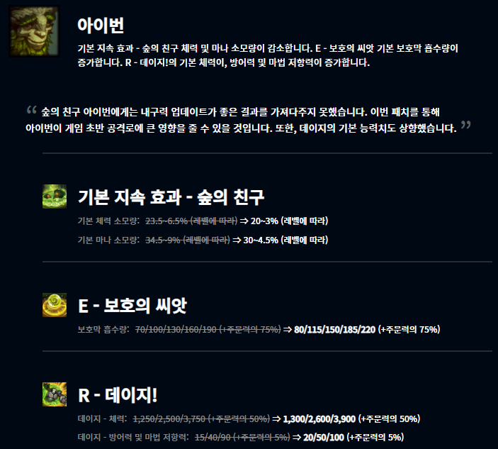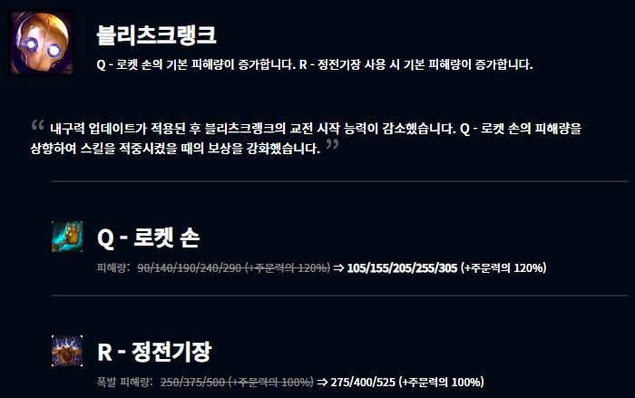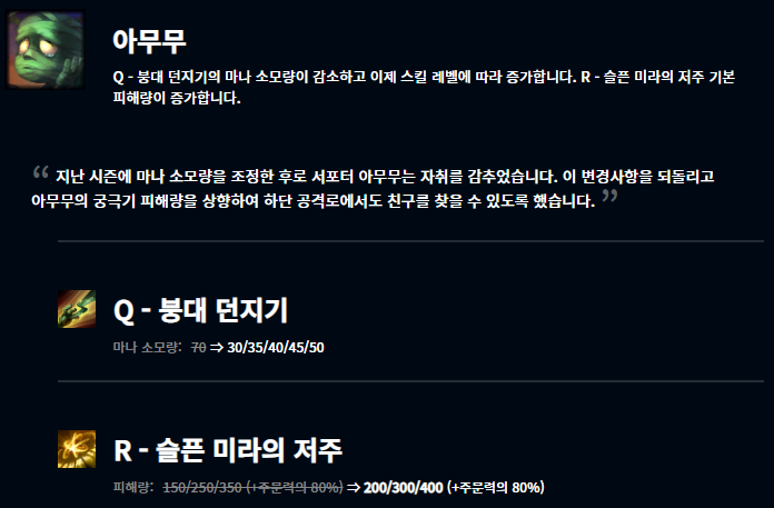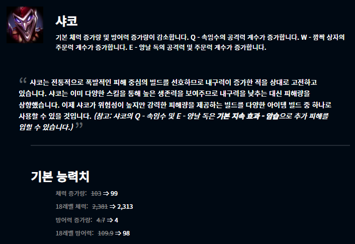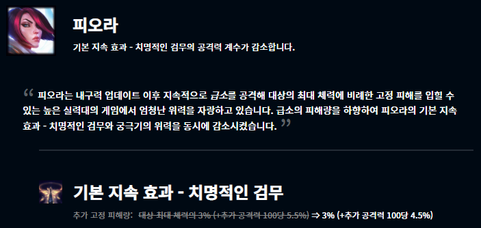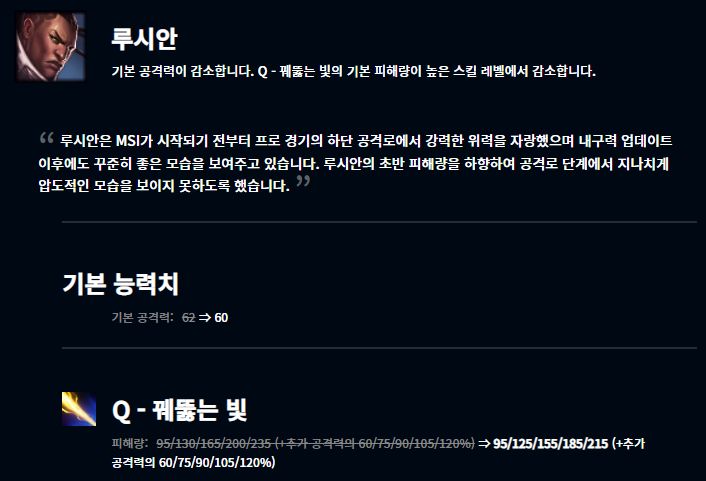 이번 패치에서는 지난 내구성 패치의 영향을 많이 받은 것 같습니다. 내구성 패치 이후 상대적으로 영향력이 떨어진 챔피언들이 버프되었습니다.