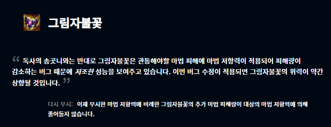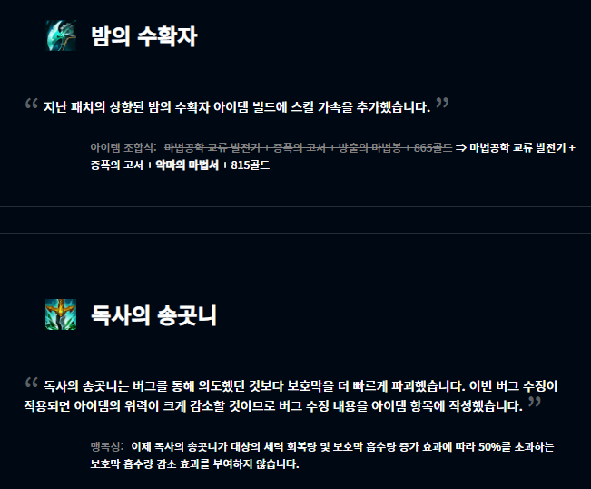아이템 부분은 밤의 수확자의 하위 아이템이 변경되었습니다. 기존에는 방출의 마법봉이었던 것이 악마의 마법서로 변경되었습니다. 독사의 송곳니의 경우는 기존 버그를 통해 보호막을 더 파괴했다고 하는데, 해당 버그를 수정했으며 이를 툴팁에 작성했습니다. 그림자불꽃은 반대로 마법 저항력이 적용되어 피해량이 감소하는 버그가 발생했다고 하며 해당 버그를 수정하였습니다.