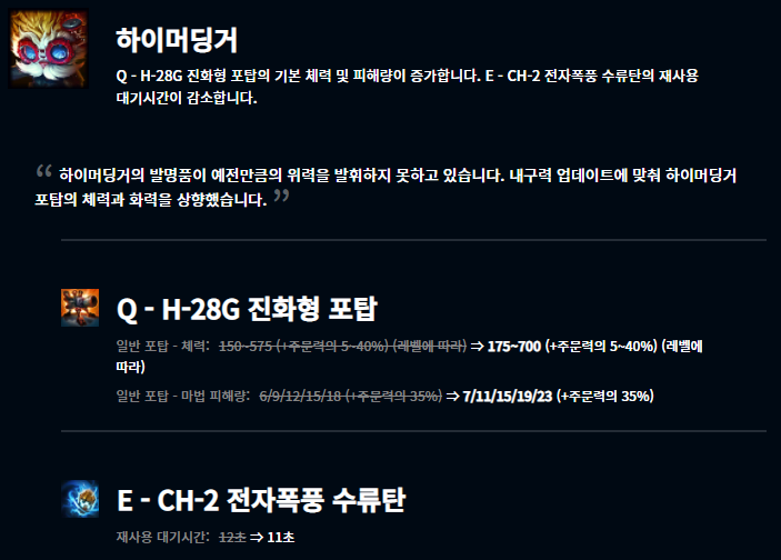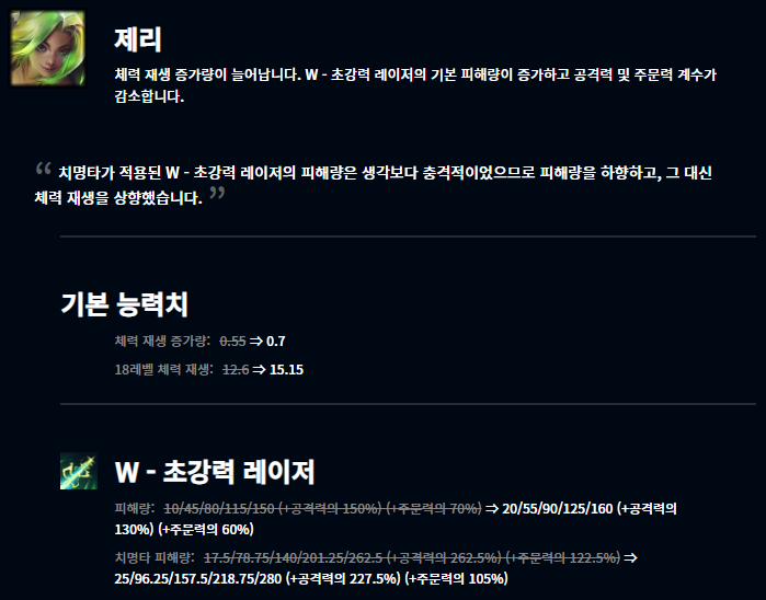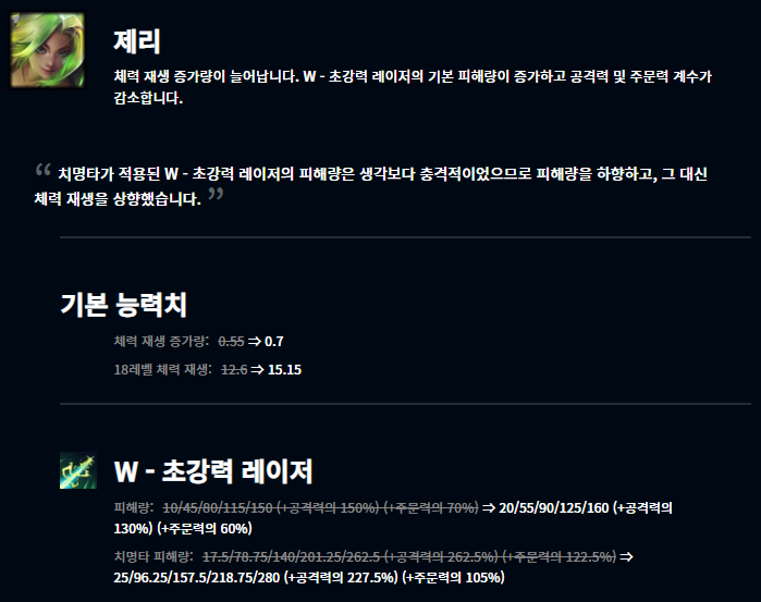 제리도 비교적 최근에 나온 챔피언으로 출시 당시에는 굉장히 사기적인 성능을 발휘했으나 거듭된 너프들로 인해 현재는 잘 사용되지 않고 있습니다. 그래서 변경점을 주어 다시 살리려는 모습입니다.