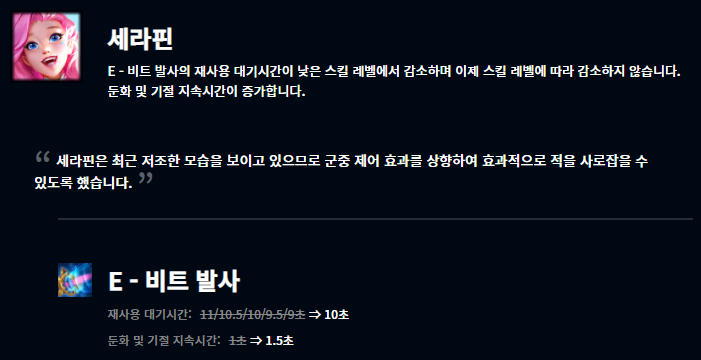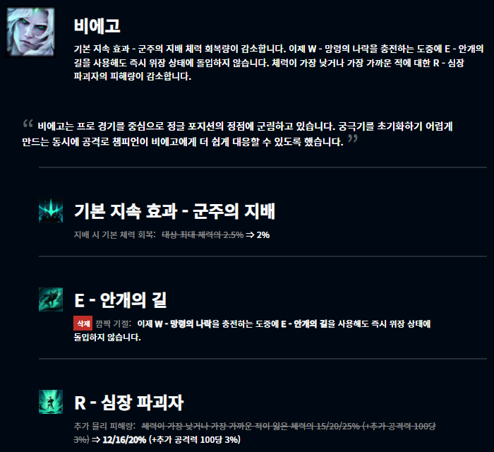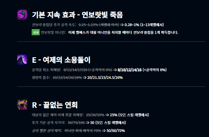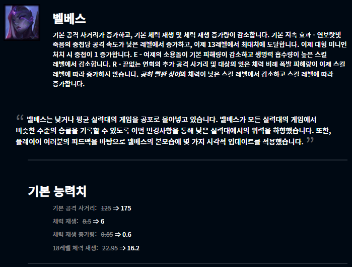 최근에 출시된 벨베스는 출시 직후부터 굉장히 좋은 성능을 보여주었습니다. 특히 낮은 티어일수록 벨베스가 활약하기는 쉬웠으며, 이에 따라 어느정도 너프를 한 모습입니다. 그 외에도 여러 챔피언들이 너프되었습니다.