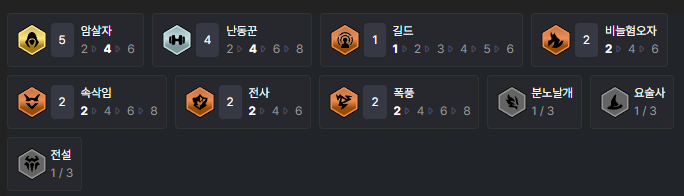 덱을 완성시키면 암살자(5), 난동꾼(4), 길드(1), 비늘혐오자(2), 속삭임(2), 전사(2), 폭풍(2) 시너지를 챙길 수 있습니다. 이 시너지는 올라프의 암살자 상징을 포함한 것이고, 추가로 암살자 특성을 하나 늘려주는 증강체를 획득하면 암살자(6)이 되어 덱이 더욱 강력해집니다.