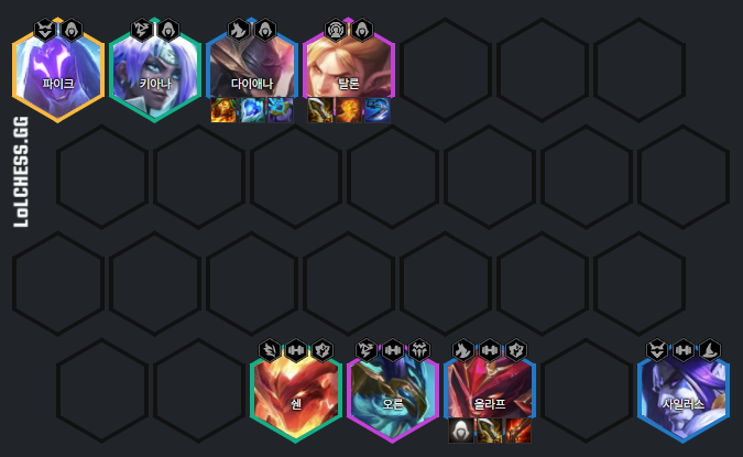 기본적으로 쉔, 키아나, 다이애나, 사일러스, 올라프, 오른, 탈론, 파이크로 이루어져 있습니다. 8레벨에 파이크를 가는 것은 필수는 아니며, 파이크를 올려도 암살자가 다섯 명이라 암살자(6) 시너지를 받지 못합니다.