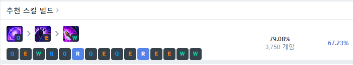 처음 1레벨에는 Q스킬을 찍어주고 2레벨에는 E스킬, 3레벨에는 W스킬을 찍어준 뒤 4레벨부터는 R-Q-E-W 순서로 스킬을 마스터해주시면 됩니다.