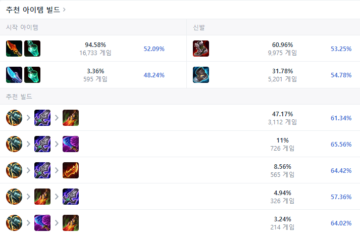 정글 벨베스 템트리는 빨간강타와 충전형 물약으로 시작하며 첫 번째 코어 아이템으로는 크라켄 학살자를 올려줍니다. 이후 상대 조합을 보고 AP, CC기가 많다 싶으면 헤르메스를, AD가 강하다면 판금 장화를 올려준 뒤 몰락한 왕의 검, 죽음의 무도를 차례로 올려줍니다. 이후 유동적으로 마법사의 최후, 피바라기, 멜모셔스의 아귀, 수호천사 등을 올려주면 되겠습니다.