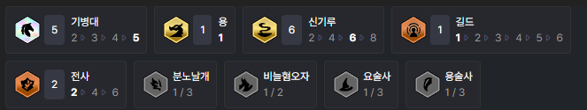 덱을 기본적으로 완성시키고 야스오에게 기병대 상징까지 넣었다고 가정했을 때 챙길 수 있는 시너지는 기병대(5), 용(1), 신기루(6), 길드(1), 전사(2)입니다. 다양한 시너지를 지니지는 않지만, 기병대와 신기루에 집중하여 강력한 모습을 보여줍니다.