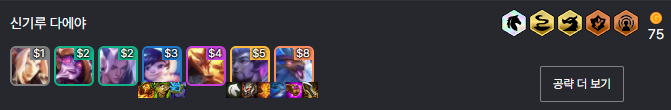 덱을 기본적으로 완성시키고 야스오에게 기병대 상징까지 넣었다고 가정했을 때 챙길 수 있는 시너지는 기병대(5), 용(1), 신기루(6), 길드(1), 전사(2)입니다. 다양한 시너지를 지니지는 않지만, 기병대와 신기루에 집중하여 강력한 모습을 보여줍니다.