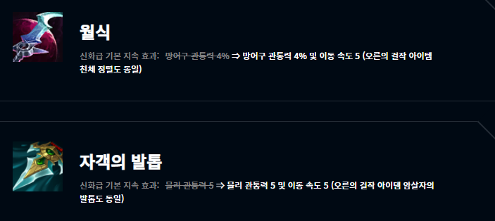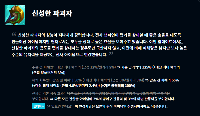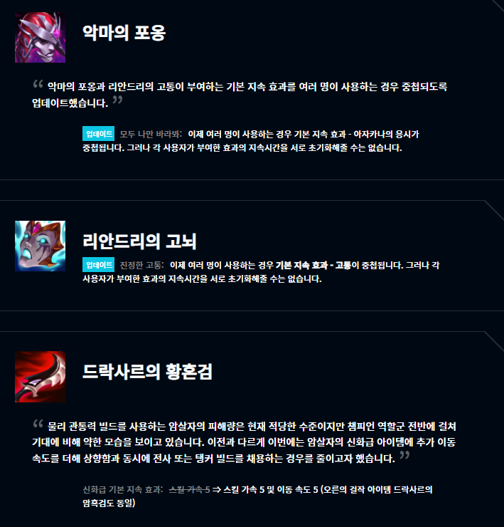 리안드리의 고뇌, 악마의 포옹 이 두 가지 아이템의 효과 데미지가 중첩될 수 있게 변경되었습니다. 기존에는 만약 아군 두 세명이 리안드리의 고뇌, 악마의 포옹이 겹쳐도 이미 해당 아이템으로 피해를 입고 있다면 하나만 적용되었던게 중첩되서 적용된다고 하네요. 드락사르의 황혼검, 월식, 자객의 발톱은 신화급 기본 지속 효과에 새로운 옵션이 추가되었습니다. 신성한 파괴자는 딜링 능력은 감소, 회복 능력은 상향시켰네요.