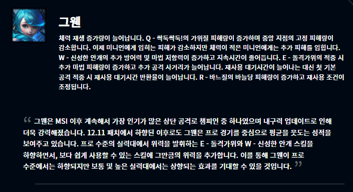 시비르의 경우 Q스킬이 던질 때 더 빠르게, 돌아올때는 살짝 더 느리게 돌아오게끔, 그리고 치명타 확률에 비례해 추가 피해를 입히게 되었습니다. 무엇보다 W 튕기는 부메랑의 메커니즘이 대폭 변경되었습니다. 그웬은 높은 티어에서 굉장히 좋은 성적을 거두고 있었기에 변경을 진행했는데요, 이번 패치로 높은 티어에서는 위력을 조금 하향, 낮은 티어에서는 위력을 상향되게 변경되었습니다.