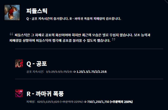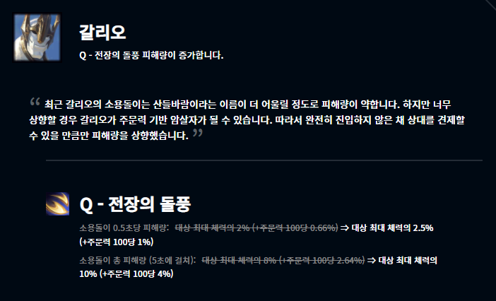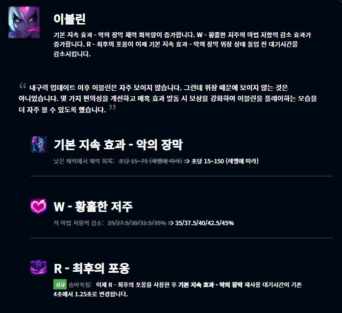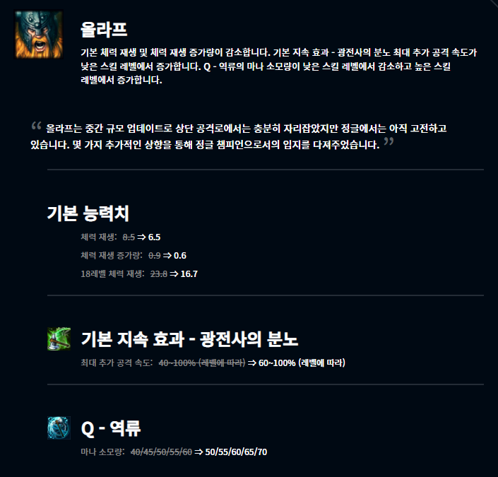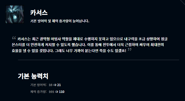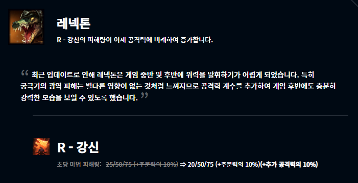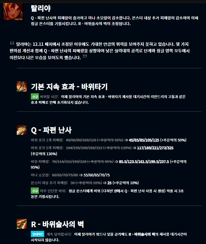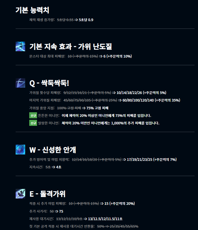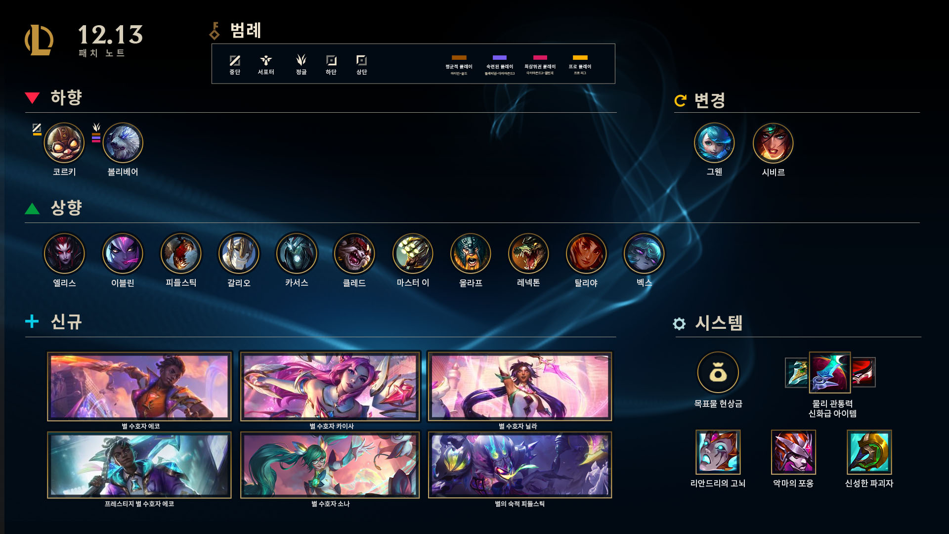 이번 12.13 패치에서는 꽤나 많은 챔피언이 버프를 먹었습니다. 그만큼 위의 챔피언들이 소환사의 협곡에서 제 실력을 발휘하지 못하고 있었기 때문이 아닐까 싶네요.