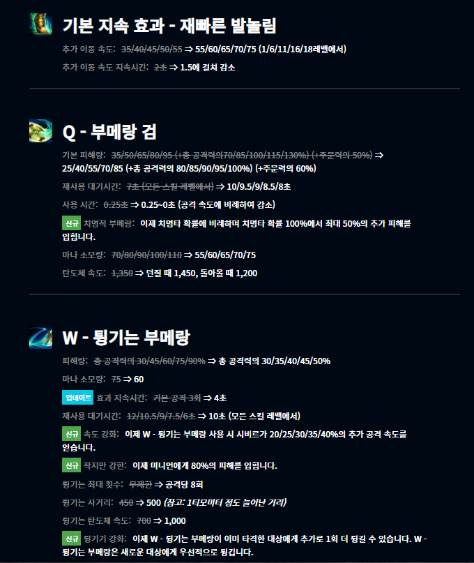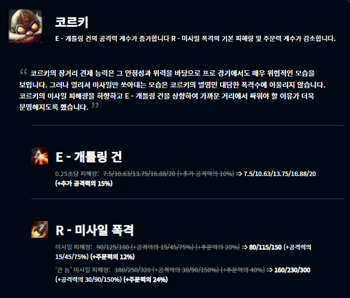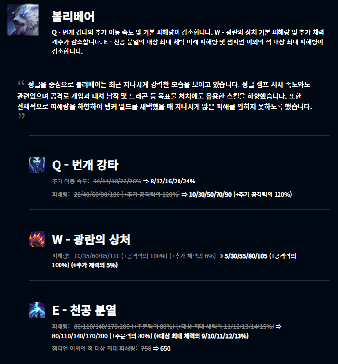 코르키와 볼리베어는 너프되었습니다. 특히 코르키 궁극기의 AP계수가 거의 반토막 나버려서 이제 AP아이템을 올리는 코르키는 사라질 듯 하네요. 볼리베어는 Q, W, E스킬 세 개가 너프되었습니다. Q스킬은 추가 이동 속도 및 기본 피해량 감소, W는 기본 피해량 및 추가 체력 감소, E는 피해량 감소 및 챔피언 이외의 적 최대 피해량 감소입니다.
