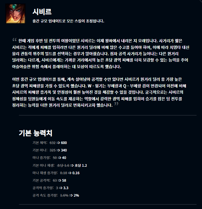 이렇게 이번 시간에는 롤 12.13 패치노트에 대해 하나하나 정리해보는 시간을 보았습니다. 게임 플레이를 하기 전 한 번쯤 읽어보면 도움이 되지 않을까 싶네요. 특히 단순 스킬의 계수가 변경된 챔피언들이 아닌, 메커니즘이 변경된 시비르같은 챔피언을 플레이하거나 상대할 때 이번 패치를 파악하고 있다면 더욱 도움이 되겠죠? 그러면 이번 포스팅은 여기서 마무리하도록 하고 다음번에는 또 다른 글로 다시 찾아오도록 하겠습니다. :)