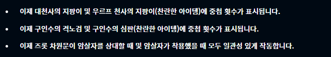 보석 건틀릿의 치명타 피해량이 감소한 대신 총 주문력이 증가했습니다. 기존에는 보석 건틀릿을 무한의 대검과 항상 함께 가는 경우가 많았는데 보석 건틀릿 단독으로 쓰일지는 과연 모르겠습니다. 그 외에 덤블 조끼의 총 방어력이 버프되었고, 대천사의 지팡이나 구인수의 격노검이 얼마나 중첩되었는지 중첩 표기가 됩니다. 그 외에는 오른의 아이템 대부분이 조정되었습니다.