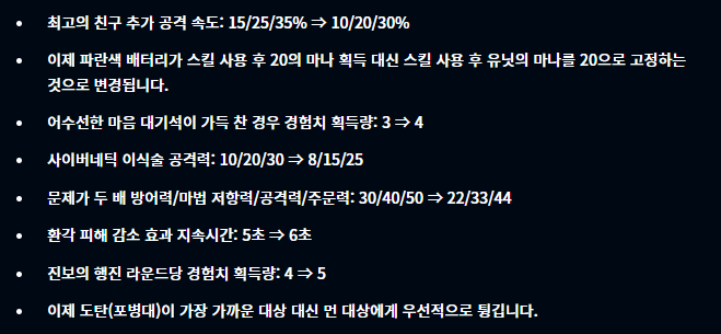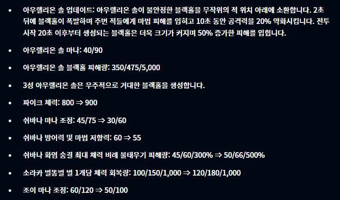 아우솔은 스킬 메커니즘이 변경되었고, 파이크는 기본 체력 증가로 버프, 쉬바나의 경우 탱킹은 약해졌지만 스킬 딜링이 크게 버프되었습니다. 소라카 역시 별똥별 별 1개당 체력 회복량이 버프되었고, 조이도 마나가 조정되며 최대 마나가 감소하여 버프입니다. 바드는 1성일 때도 너무 강력한 모습을 보여줬는데 1성일 때의 기절 지속시간이 너프되었습니다.