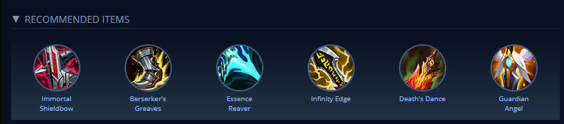 처음 시작은 도란검과 포션 하나로 시작해주시고, 첫 코어 아이템으로는 불멸의 철갑궁을 올려줍니다. 이후 광전사의 군화를 올려주고 정수 약탈자, 무한의 대검을 순서대로 올려줍니다. 그 이후에는 상황을 보고 유동적으로 죽음의 무도, 수호 천사, 도미닉 경의 인사, 맬모셔스의 어귀 등을 올려주면 되겠습니다.