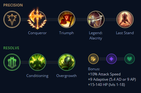 현재 닐라는 메인 룬으로 대부분 정밀에서 정복자를 사용합니다. 하위 룬으로는 승전보, 전설: 민첩함, 최후의 저항을 들어줍니다. 보조 룬으로는 결의에서 사전 준비, 과잉 성장을 들어주며 능력치 파편에는 공격 속도, 적응형 능력치, 체력을 넣어줍니다. 해외 유저들 기준이며 국내에서는 룬 부분은 거의 일치할 것이고 능력치 파편에서는 체력 대신 방어력을 넣어줄 가능성이 크다고 생각되네요.