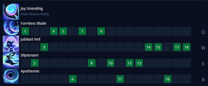 닐라 스킬은 처음 1레벨에 Q스킬을 찍어주고 2레벨에는 E스킬, 3레벨에는 W스킬을 찍어줍니다. 그 이후로는 R-Q-E-W 순서로 스킬을 마스터해주면 됩니다.