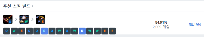 처음 시작 3레벨에는 Q, W, E스킬을 하나씩 찍어준 뒤 이후 4레벨부터는 R-Q-W-E 순서로 스킬을 마스터해주면 되겠습니다.
