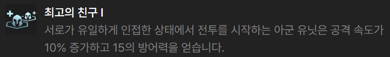 덱을 완성시키면 챙길 수 있는 특성들은 음유시인(1), 포병대(4), 축제(3), 길드(1), 수호자(2), 신비술사(2), 일깨우는자(2), 조련사(2)입니다. 증강체를 통해 포병대나 축제 시너지를 강화해주면 좋습니다.