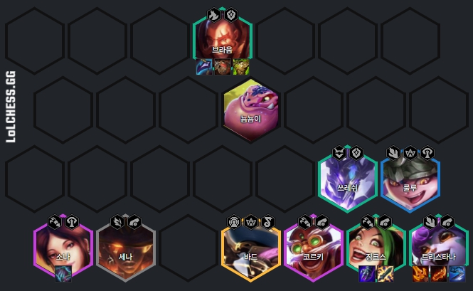 기본 덱 구성은 세나, 브라움, 쓰레쉬, 징크스, 트리스타나, 룰루, 소나, 코르키, 바드입니다. 트리스타나가 메인 딜러, 브라움이 메인 탱커로 사용됩니다. 9레벨을 찍어야 덱을 완성시킬 수 있지만, 8레벨에도 충분히 강력한 모습을 보여줍니다.