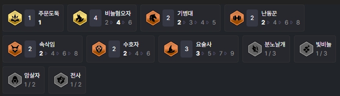 덱을 완성시키면 챙기는 특성들은 주문도둑(1), 비늘혐오자(4), 기병대(2), 난동꾼(2), 속삭임(2), 수호자(2), 요술사(3)입니다. 초밥에서 뒤집개를 먹거나 혹은 증강체를 통해 기병대 특성을 늘려주면 좋습니다.