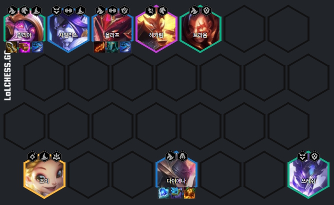 릴리아에게 무한의 대검, 보석 건틀릿, 거인 학살자를 최우선적으로 주고 이어서 다이애나에게 얼어붙은 심장, 이온 충격기, 태양불꽃 망토를 주는게 좋습니다. 그 외에는 공격 속도 관련 아이템이 나오면 올라프를 주거나 쇼진의 창을 조이에게 주는게 좋습니다.