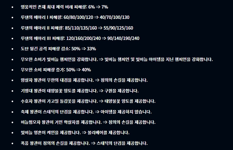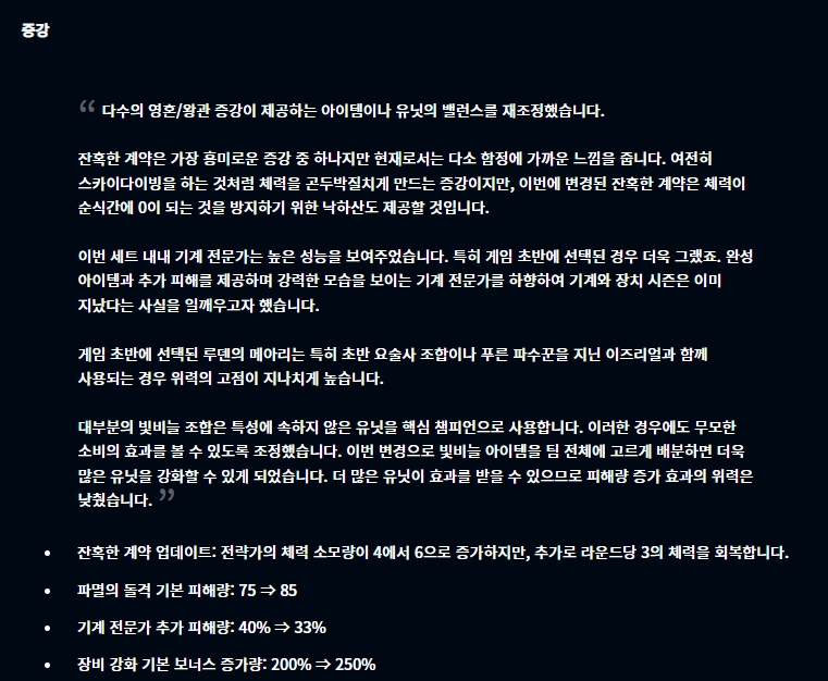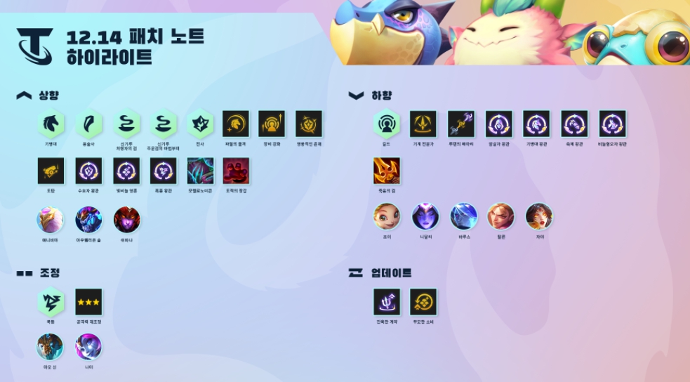 12.14 패치노트 하이라이트만 봐도 많은 부분이 변경된 것을 알 수 있습니다. 우선 특성은 기병대, 용술사, 신기루(처형인의 검, 주문검의 마법부여), 전사는 상향되었고, 반면 길드는 하향되었습니다. 증강체의 경우 파멸의 돌격, 장비 강화, 영롱적인 존재, 도탄, 수호자 왕관, 빛비늘 왕관, 폭풍 왕관은 상향, 반면 기계 전문가, 암살자 왕관, 기병대 왕관, 축제 왕관, 비늘혐오자 와오간은 하향되었습니다. 아이템 부분은 모렐로노미콘, 도적의 장갑 상향, 죽음의 검, 루덴의 메아리는 하향, 챔피언 부분에서는 애니비아, 아우솔, 쉬바나는 상향, 조이, 나미, 바루스, 탈론, 자야는 하향되었습니다. 이밖에도 많은 것들이 변경되었으니 하나하나 알아봅시다.