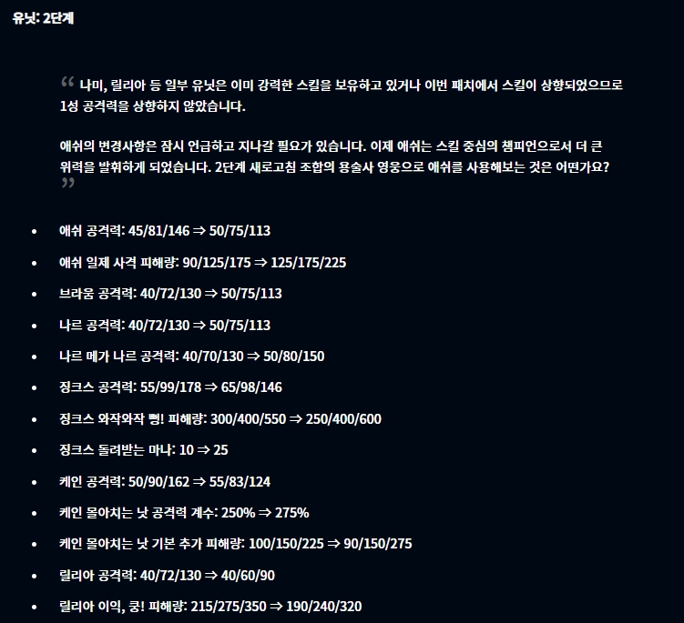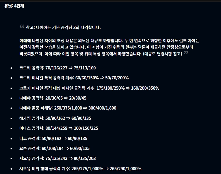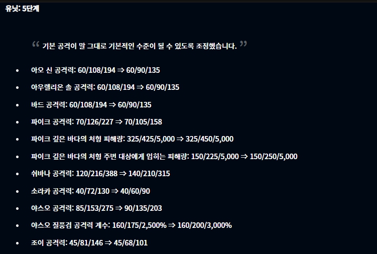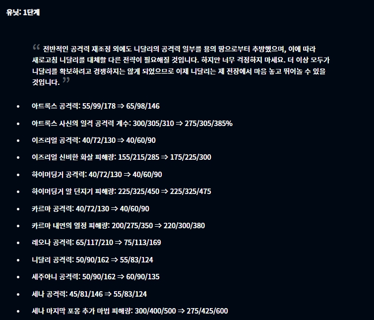 눈여겨봐야 할 것들은 대체로 전설급 2성 용들의 위력이 상향되었다는 점입니다. 그 외에 요술사와 함께 자주 사용되던 조이는 살짝 너프한 감이 있네요. 하지만 챔피언 밸런스 조정은 여기서 끝이 아니라는 사실입니다. 이 정도면 대규모 패치가 아니겠죠? 전반적인 챔피언들의 2성, 3성일때의 공격력을 너프시켰습니다. 살펴보도록 하죠.