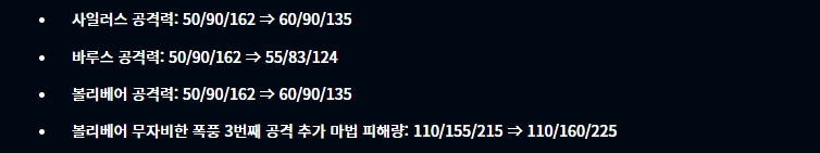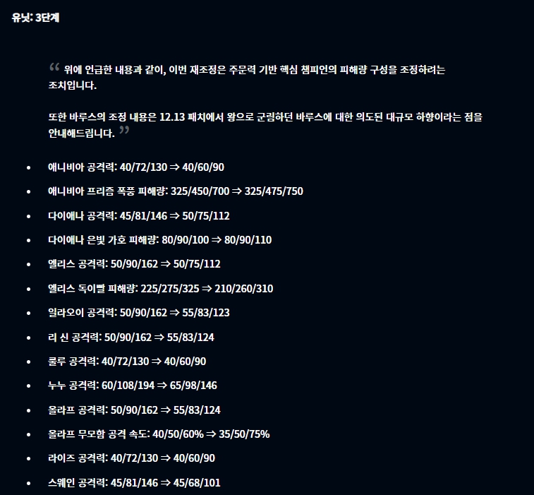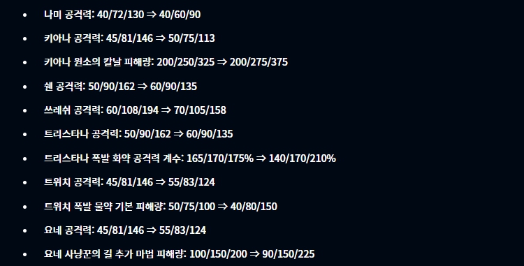 보면 거의 대부분 챔피언들의 기본 공격력이 조정된 것을 알 수 있습니다. 이에 따라 바루스나 자야, 트리스타나 등 기본 공격 비중이 딜의 비중을 높게 차지하던 챔피언들이 너프되었다고 볼 수 있겠습니다. 이번 공격력 조정으로 앞으로의 롤토체스 전투 양상은 스킬 비중이 훨씬 올라갈 예정입니다.