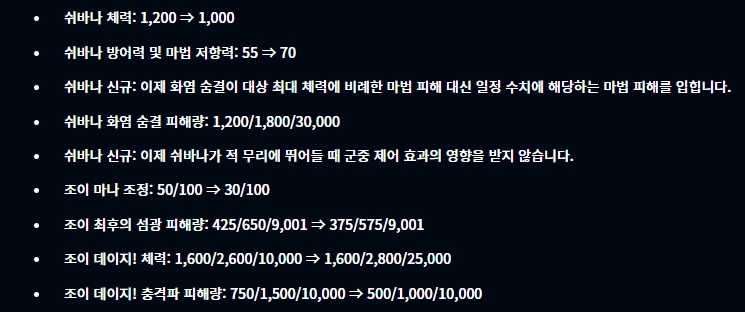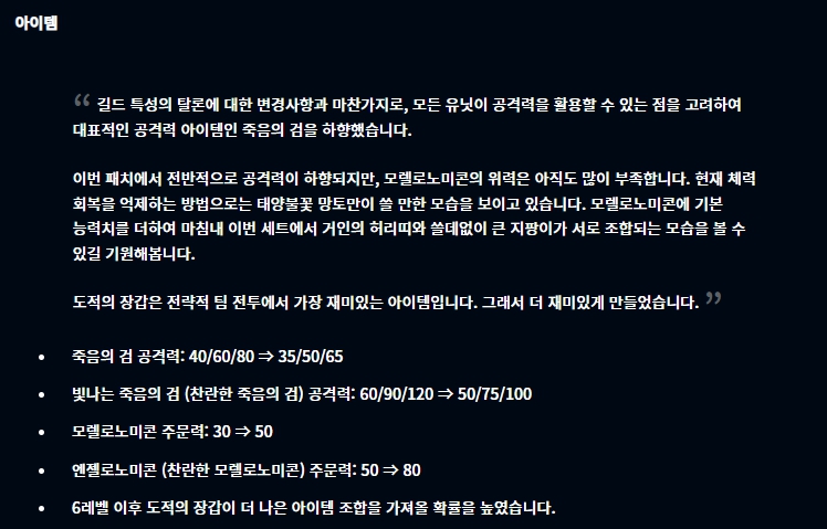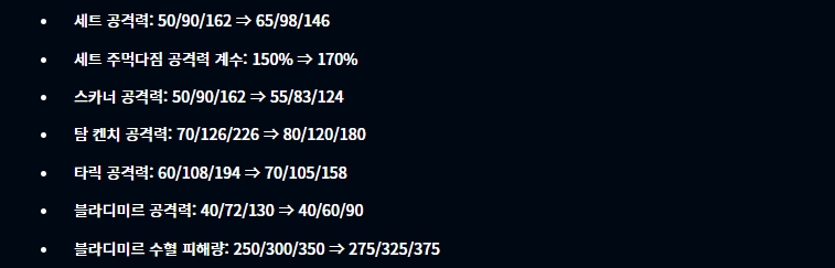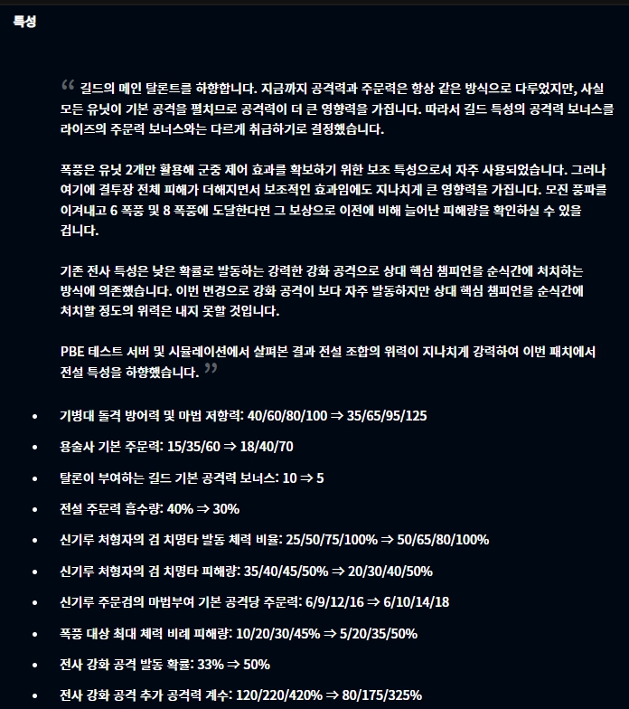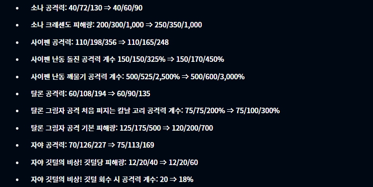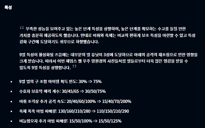 가장 큰 변화는 전사와 별 특성인 것 같습니다. 전사는 강화 공격 확률이 기존 33%에서 50%로 크게 늘어났고, 대신 강화 공격시 공격력 계수가 120/220/420%에서 80/175/325%로 줄어들었습니다. 또 별(9) 특성 적용 시 조합 아이템 획득 빈도가 30%에서 75%로 늘어나면서 완성을 시킨다면 아이템을 얻을 확률이 대폭 늘어났죠. 이 이외에도 여러 특성들의 수치들이 조정되었습니다.