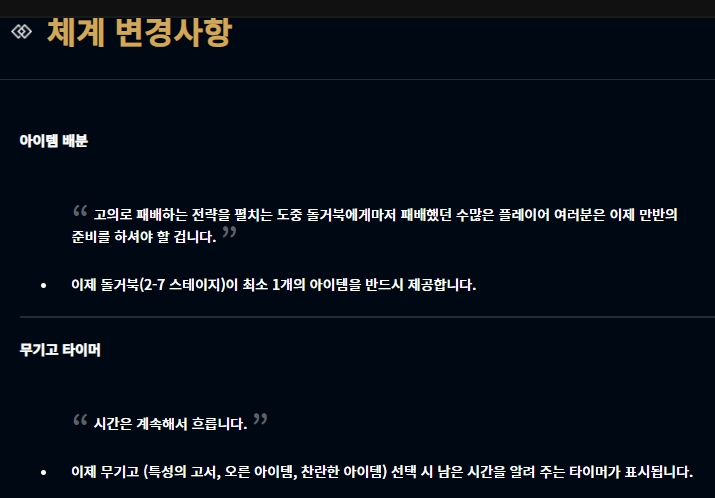 이제 2-7에서 등장하는 돌거북이 최소 1개의 아이템을 반드시 제공하도록 변경되었고, 무기고(특성의 고서, 오른 아이템, 찬란한 아이템) 선택시 남은 시간을 알려주는 타이머가 표시됩니다.