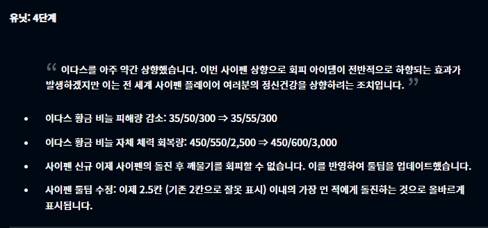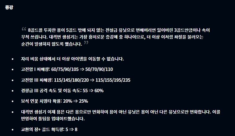 증강체들 역시 대부분은 자잘한 수치 조절이거나 플래티넘 증강체에서 영혼 선택시 지급되는 아이템의 변경입니다. 또 대격변 생성기의 경우 용은 이제 다른 용으로만 변화하고, 용이 아닌 유닛은 용이 아닌 다른 유닛으로만 변화하게 됩니다. 기존에는 3코스트 챔피언들이 시오유, 다에야, 사이펜, 이다스 등 8코스트 용으로도 변경되곤 했었는데 이러한 일이 없다는 것이죠.