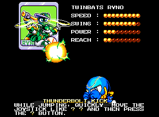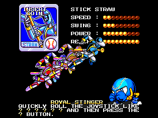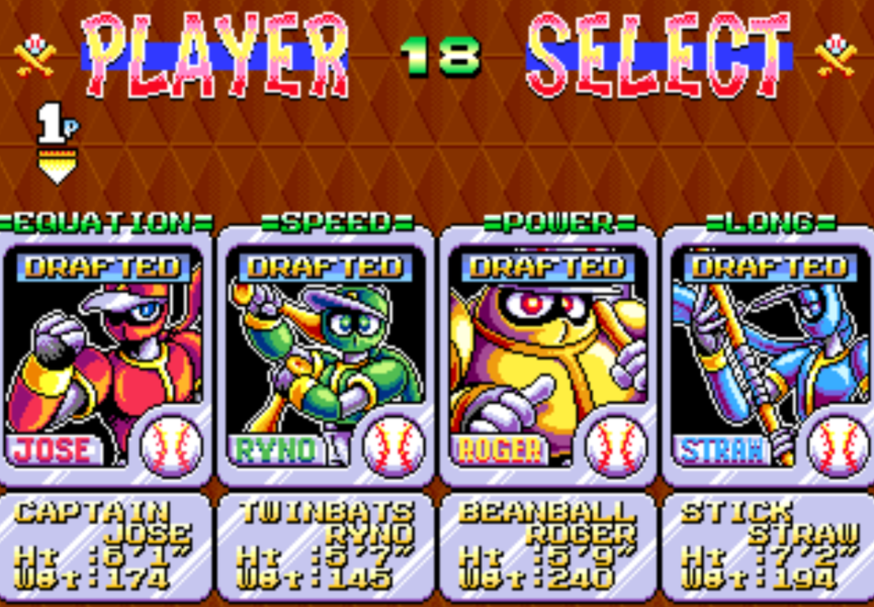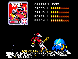 캐릭터는 총 4명이고 과거 오락기를 이용해 플레이할때는 레드, 그린, 옐로, 블루라는 단순히 색깔명으로 캐릭터들을 불렀지만 나중에 알고 보면 각자 캡틴 호세, 트윈베츠 리노, 빈볼 로저, 스틱 스트로라는 이름이 있더군요. 여하튼 닌자 베이스볼은 캐릭터들마다 공격의 형태나 기술, 그리고 필살기가 다 달랐기 때문에 하나하나 해보는 맛이 있었습니다. 그중에서도 제가 이 게임을 할 당시에는 많은 사람들이 호세(그린)를 골랐는데 그 이유는 점프버튼을 누르면서 대충 아무렇게나 조이스틱을 졸려도 필살기가 발송되었고, 필살기의 위력과 범위도 상당히 좋았기 때문에 많은 사람들의 선택을 받았죠.