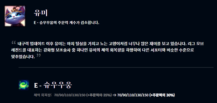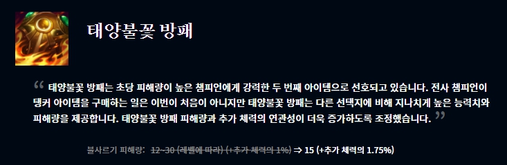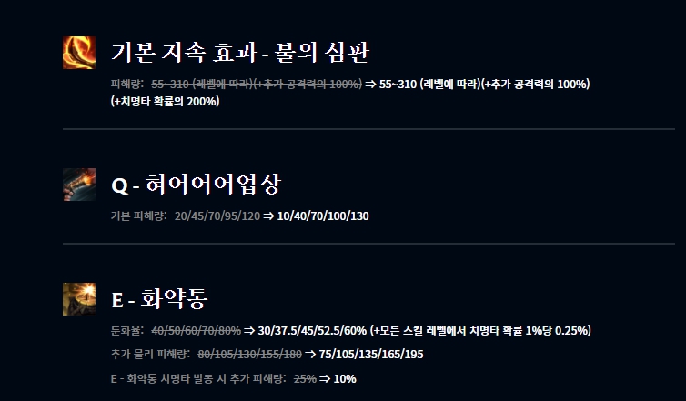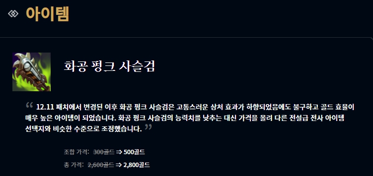 화공 펑크 사슬검은 가격 대비 너무 좋은 성능을 보여준 모습입니다. 그렇기 때문에 가격이 오르게 되었죠. 또한 자신이나 아군에게 회복 및 보호막 효과를 주는 강화형 보조술사 아이템들이 싹 너프되었습니다. 내구력 패치 이후 강화형 서포터들이 수혜를 입었는데, 거기에 이런 아이템들까지 더해지면 더욱 그 위력이 올라가서 너프가 되었습니다. 태양불꽃 방패는 최근 탱커형 챔피언이 아닌, 전사군 챔피언들도 해당 아이템을 올려 너무 지나친 성능을 보여주었습니다. 불사르기 기본 피해량을 낮추고 추가 체력 비례 데미지를 늘려 전사형 챔피언들이 잘 올리지 않도록 했네요.