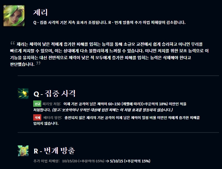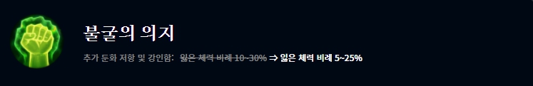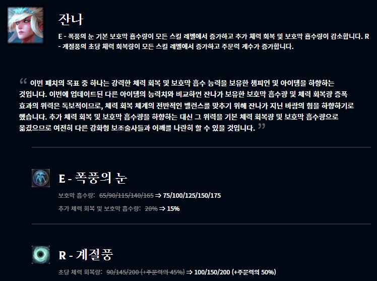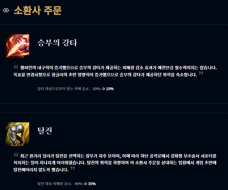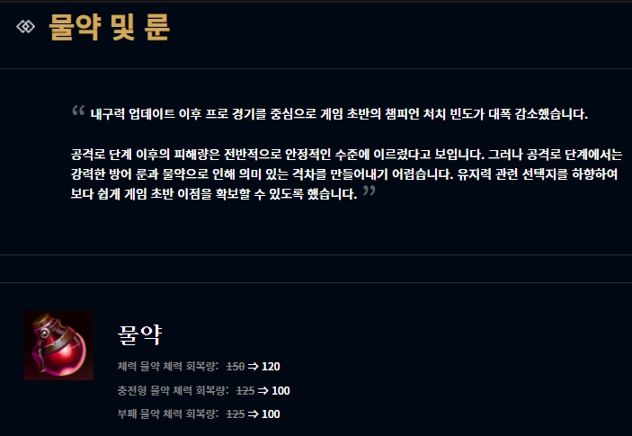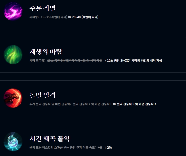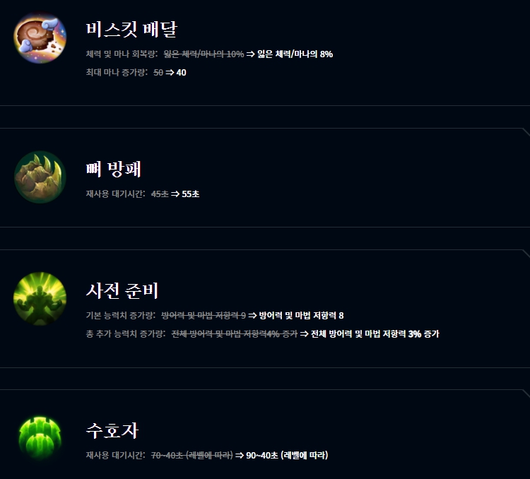 기본 물약과 비스킷이 너프되었고, 그 외에도 뼈방패, 사전 준비, 수호자, 주문 작열, 재생의 바람, 돌발 일격, 시간 왜곡 물약, 불굴의 의지가 변경되었습니다. 룬은 돌발 일격과 주문 작열을 제외하면 다 너프입니다.
