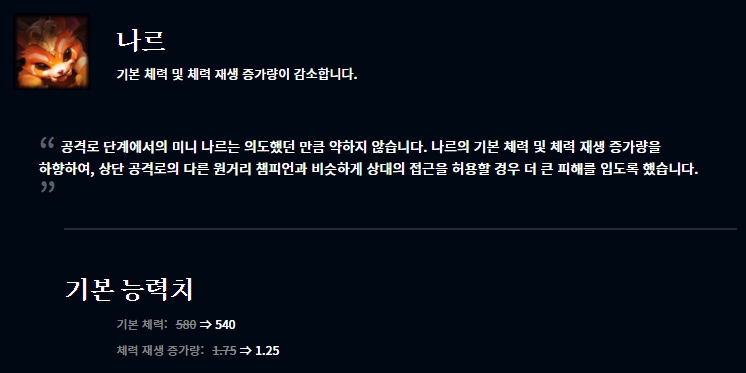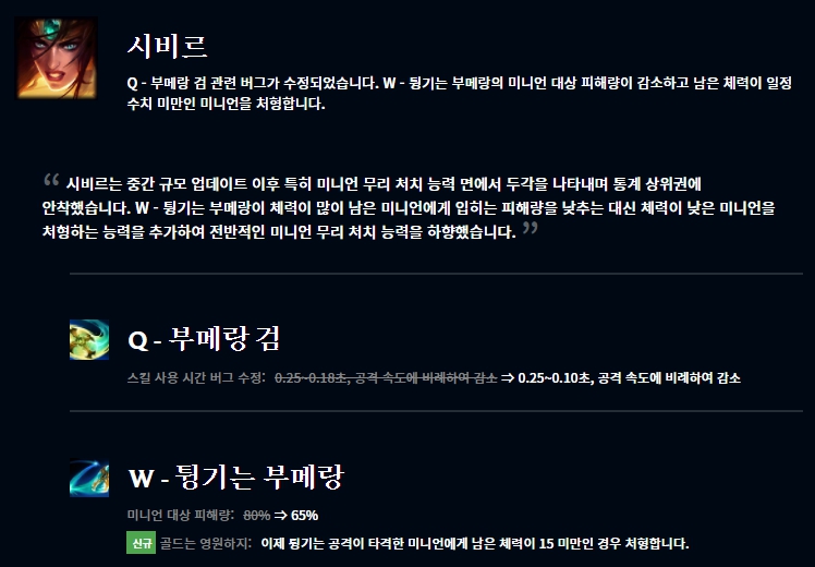 너프된 챔피언은 나르, 레나타, 세라핀, 시비르, 유미, 제리입니다. 시비르는 지난 번 패치때 스킬 셋이 변하면서 사실상 엄청난 버프를 받았었는데, 결국 이렇게 다시 너프를 먹게 되었네요.