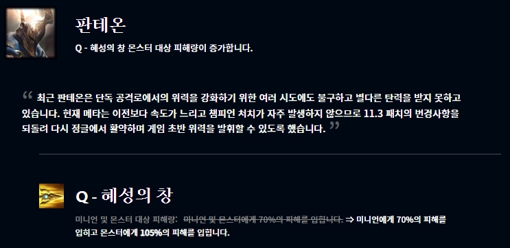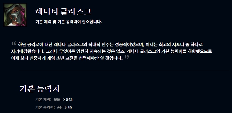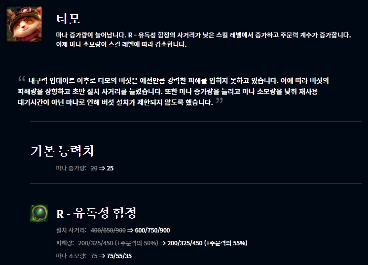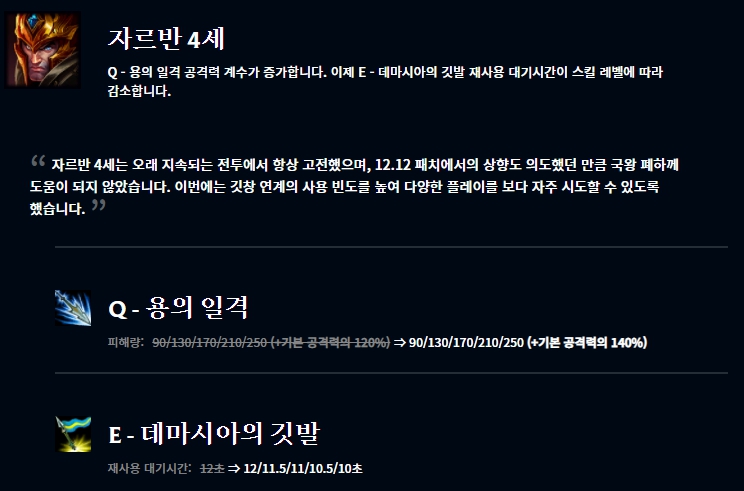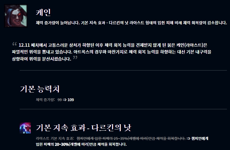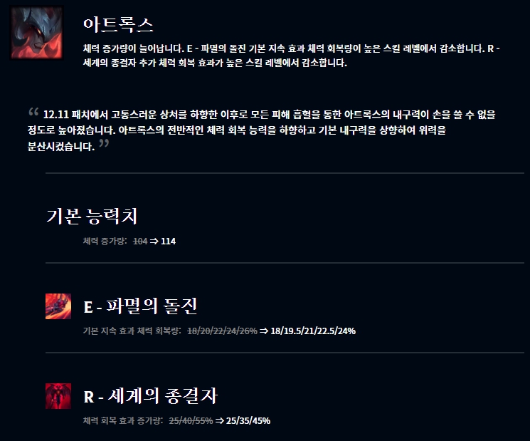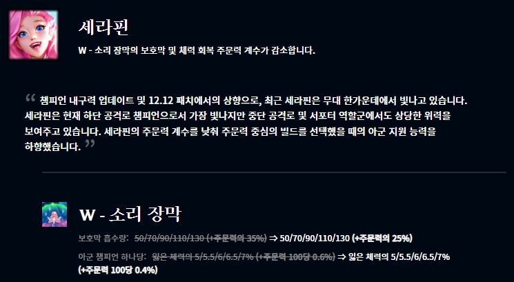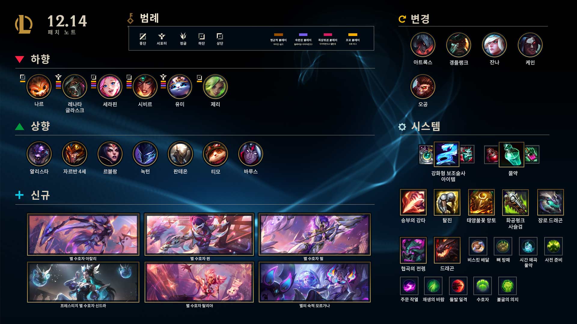 12.14 패치노트 하이라이트입니다. 구체적으로 어떻게 상향/하향되었고, 변경되었는지는 나와있지 않지만 대략적인 이번 12.14 패치의 개요를 확인할 수 있습니다.